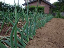 秋蒔きの石倉ネギはもう一丁前に成長していたので、曲がりネギにするように植え替えをしてやった。仙台曲がりネギは8月の日照り時期にするらしいが、ネギの成長も良かったし真夏にする仕事ではないぞと判断した。ネギを曲げる事でストレスを与えると甘くて美味しいネギになるそうだ。 |