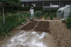 私の役目は堆肥を入れ消石灰をふり畝を作る事。化成肥料はこの時点では入れず、蔦と葉色の状態を見ながら少しずつ入れる。 |