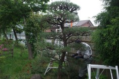 | 二日間大農家のお庭にお邪魔した。初日現場に到着した瞬間帰ろうと思った。相方の遠賢ちゃんもそう感じたという。兎に角松や高野槇それに糸ヒバの高いこと。わたしたちの手に負える庭では有りません。ところが親方はこんなの当たり前のような雰囲気でしゃべっている。正直に言いましたよ、帰っていいですか?とね。そうしたら12尺でとどく範囲でいいからやっていけとのこと。わたしは写真下の高さはないが横に広がっている黒松と天端を親方に剪定してもらった糸ヒバを初日にさせていただいた。高所恐怖症と言うだけで植木職人失格なのだが、そこはシルバーセンターですからできる範囲でよい。でも転落防止のため三脚を植木にしっかり結わえ、転落防止の為の安全ベルトでしっかりロックして剪定した。 |