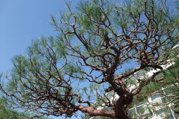 玄関前の松は用務員さんのメチャ伐りで忌枝だらけ。枝の流れを整えるのに苦労した。