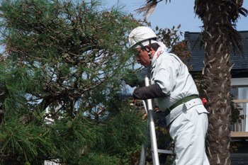76歳の親方(左)は高木大好き、ほぼ一日バリカン仕事。右は相方の遠賢68歳。植木の中から透かし剪定に挑戦。 |